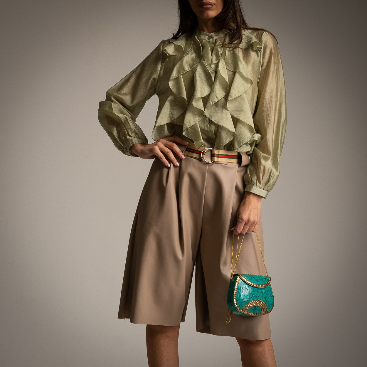 Légère et raffinée, cette blouse beige semi-transparente séduit par son jeu subtil de transparence et son allure romantique.