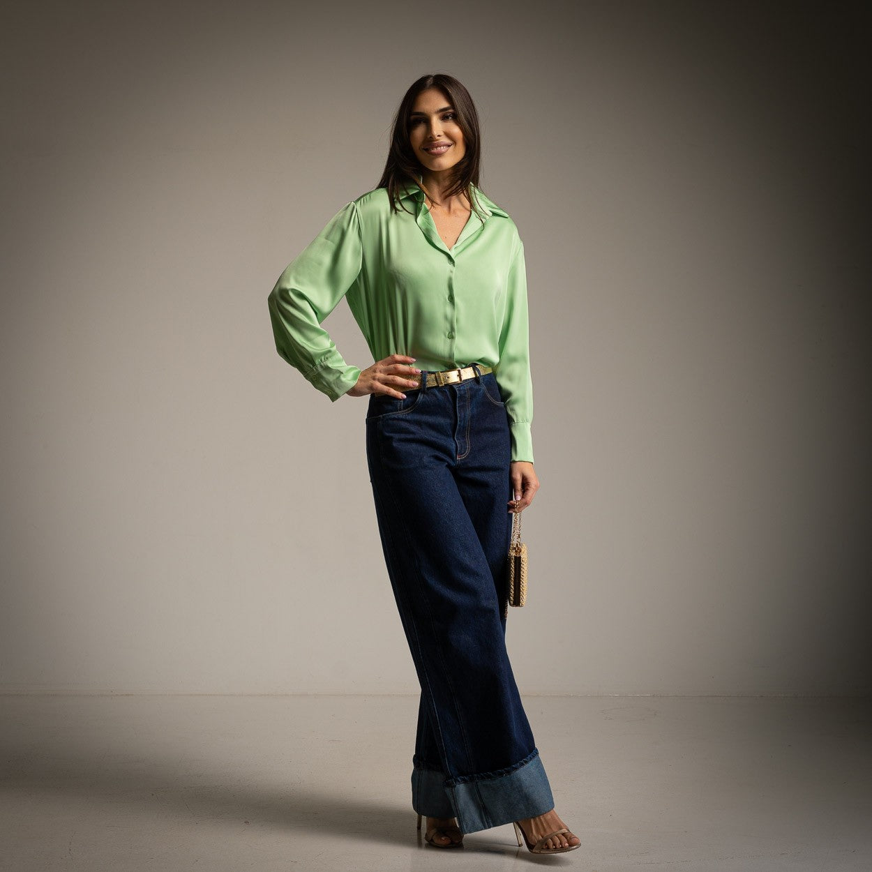 Élégance et raffinement se rencontrent dans ce chemisier en satin vert, confectionné en polyester pour une texture douce et soyeuse.