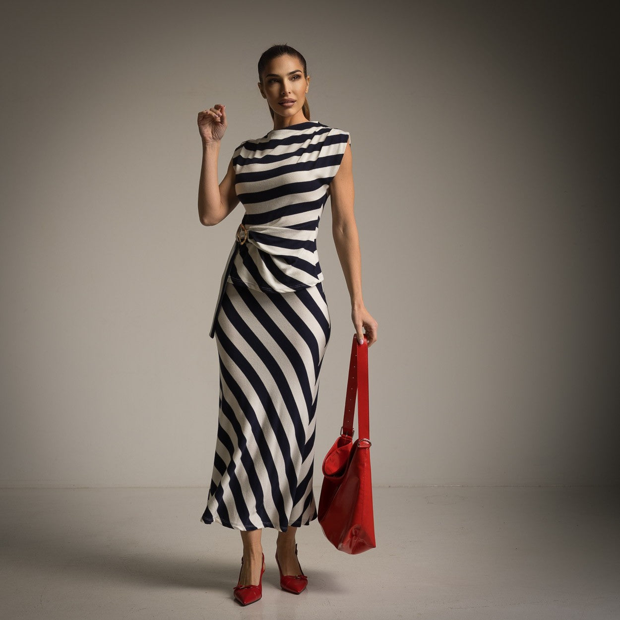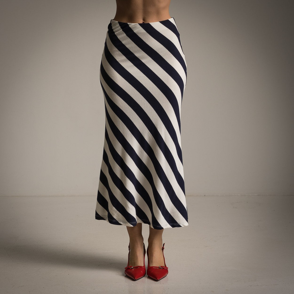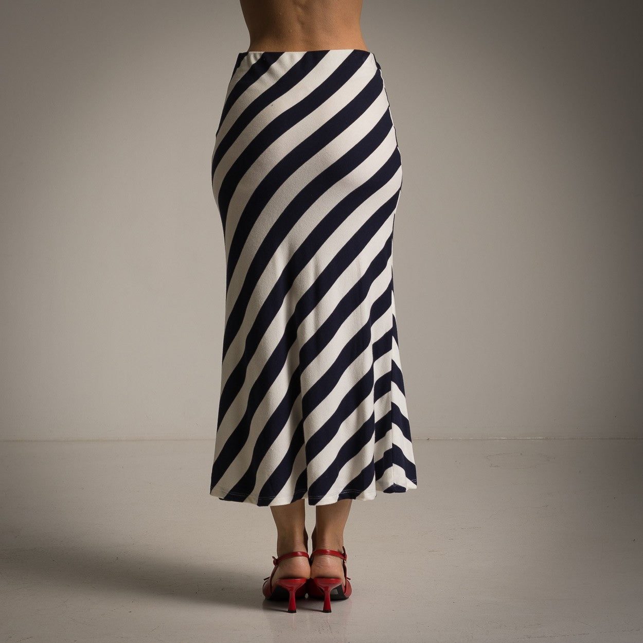 Alliant confort et style, cette jupe midi en maille séduit par son design à rayures biais bleu marine, apportant une touche graphique et moderne à votre tenue.