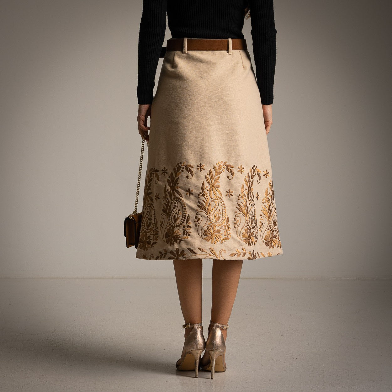 Cette jupe mi-longue beige se distingue par son élégance intemporelle et ses finitions raffinées.