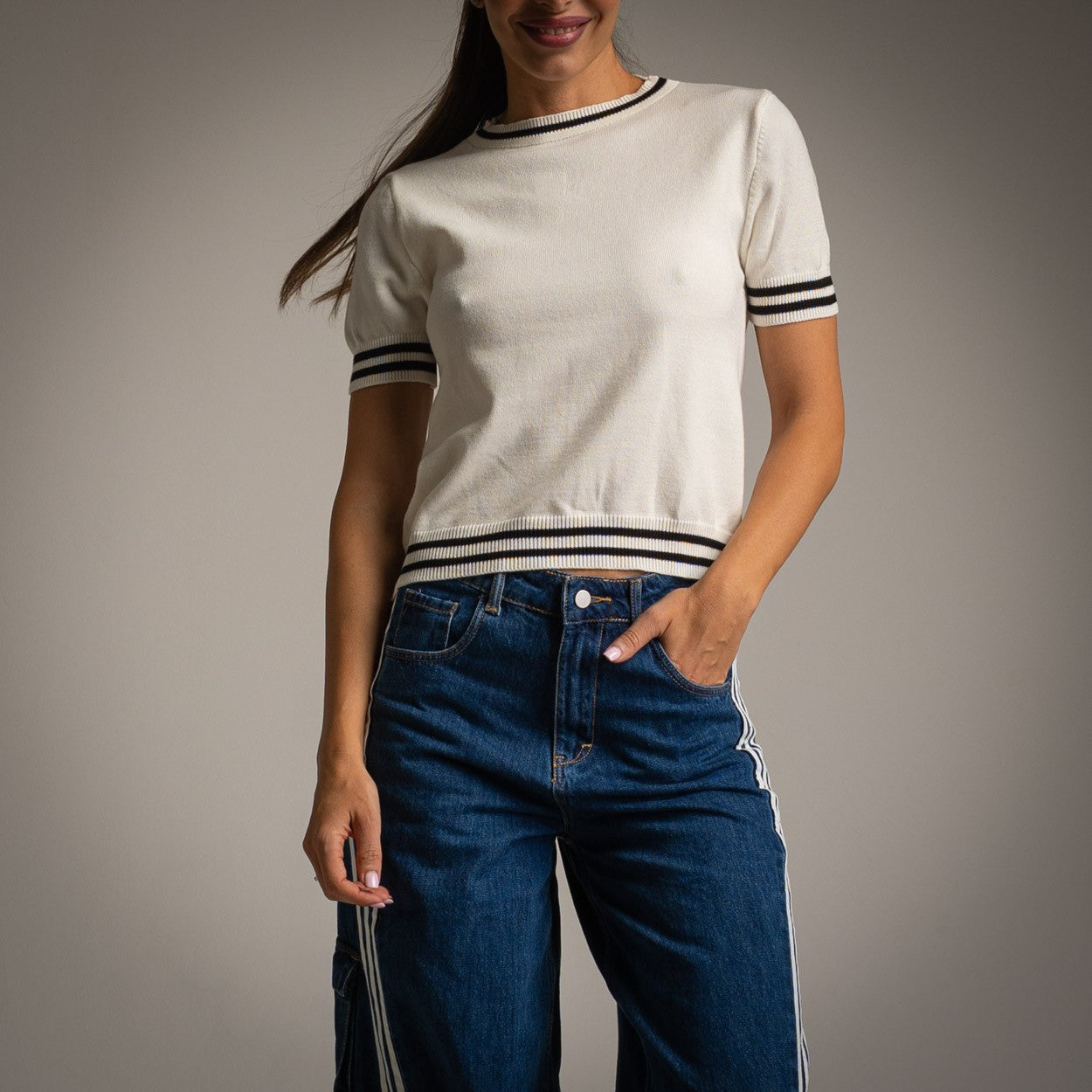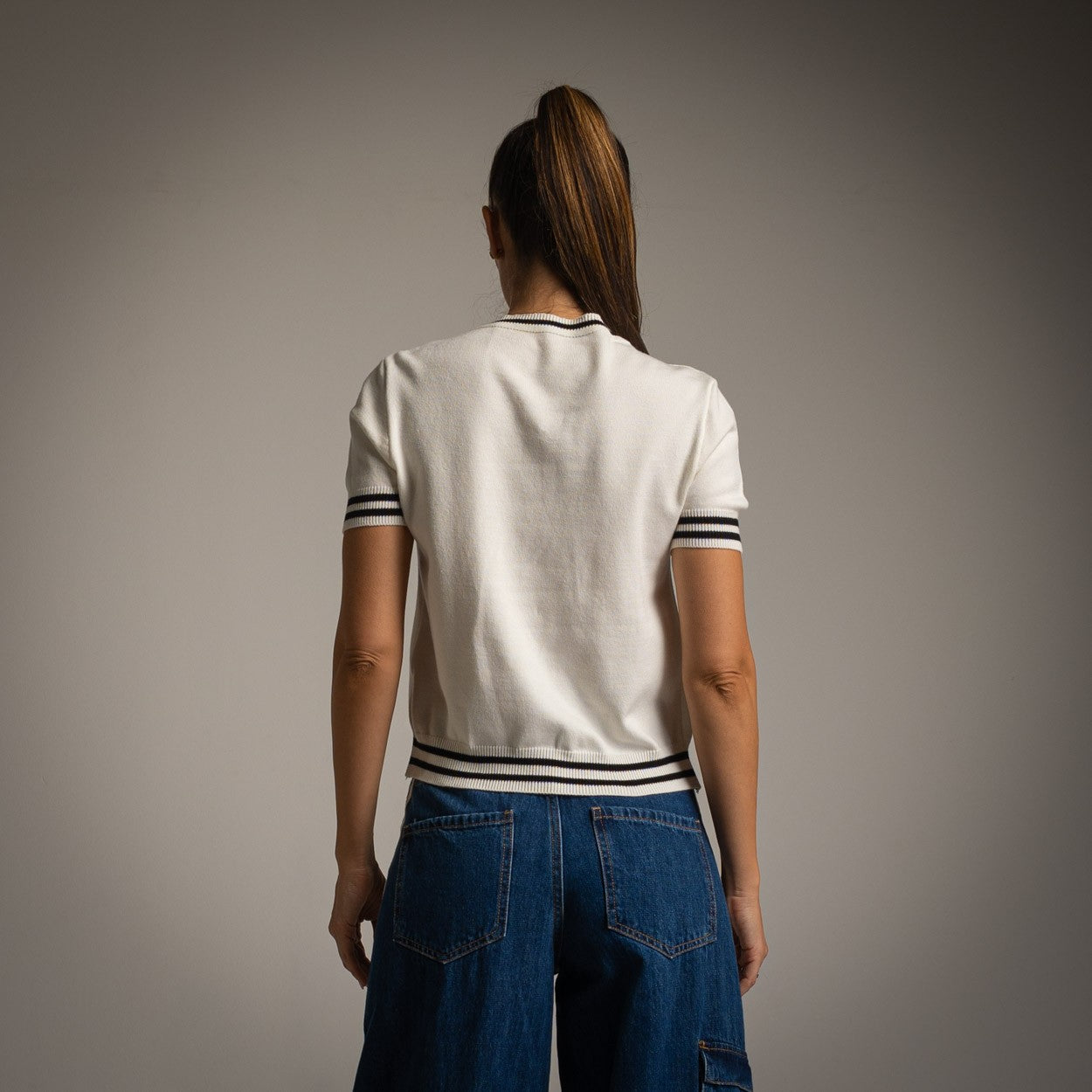 Son design épuré est sublimé par des rayures élégantes sur le col et les emmanchures, qui apportent une note dynamique et moderne.