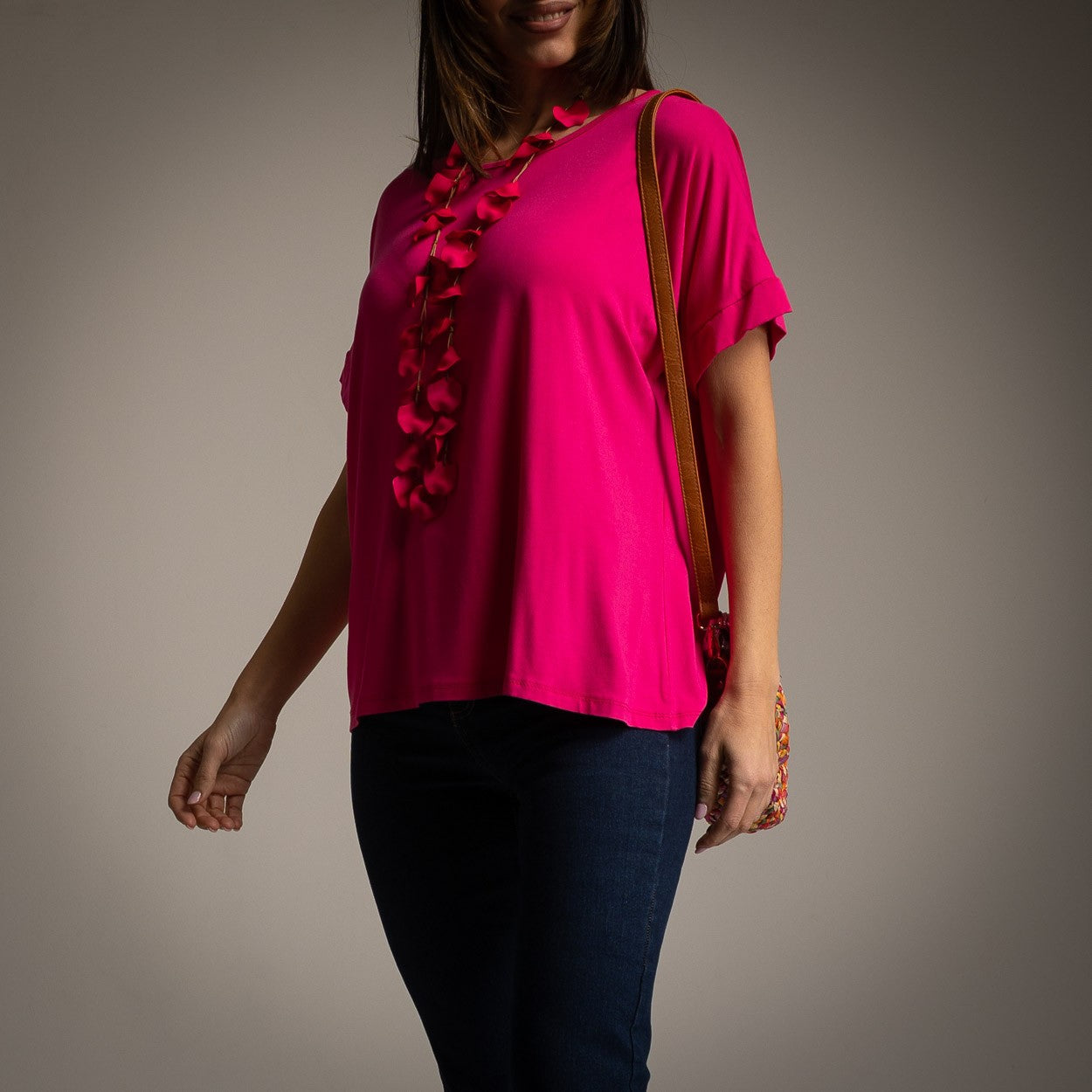 Ajoutez une touche de sophistication à votre tenue avec ce T-shirt fuchsia à manches courtes, revisité avec un détail original : une rangée de boutons au dos, apportant une note d’élégance discrète et moderne.