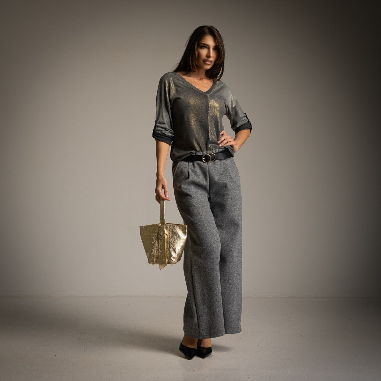 Ce t-shirt en lurex avec un col en V est fabriqué dans une matière viscose douce et fluide.